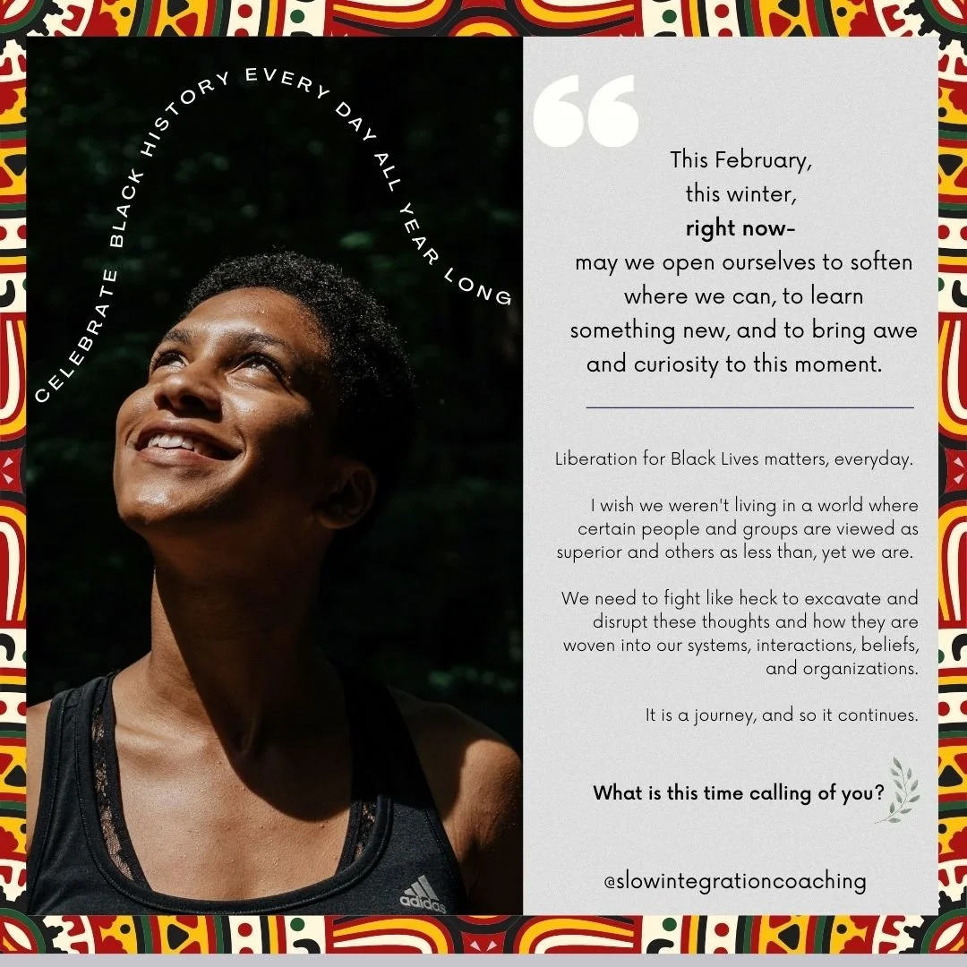 Liberation for Black Lives matters every day. The rest of this winter as we engage with ourselves and in community, may we open ourselves to soften where we can, to learn something new, and to bring awe and curiosity to this moment in our collective history/herstory.